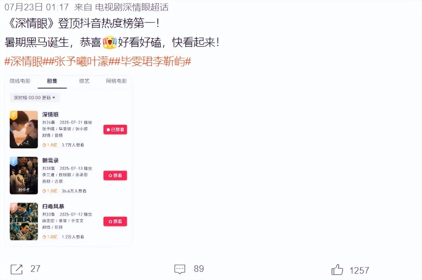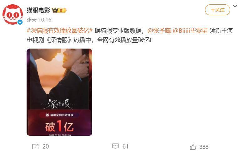 张予曦和毕雯珺都不是自带热度的演员,所以《深情眼》开播后,这部剧的关注度是非常低的,但因为原著粉的努力安利,这部剧也获得关注,目前,《深情眼》的有效播放量已经破亿,这对于小成本甜宠剧来说,已经非常不错了。